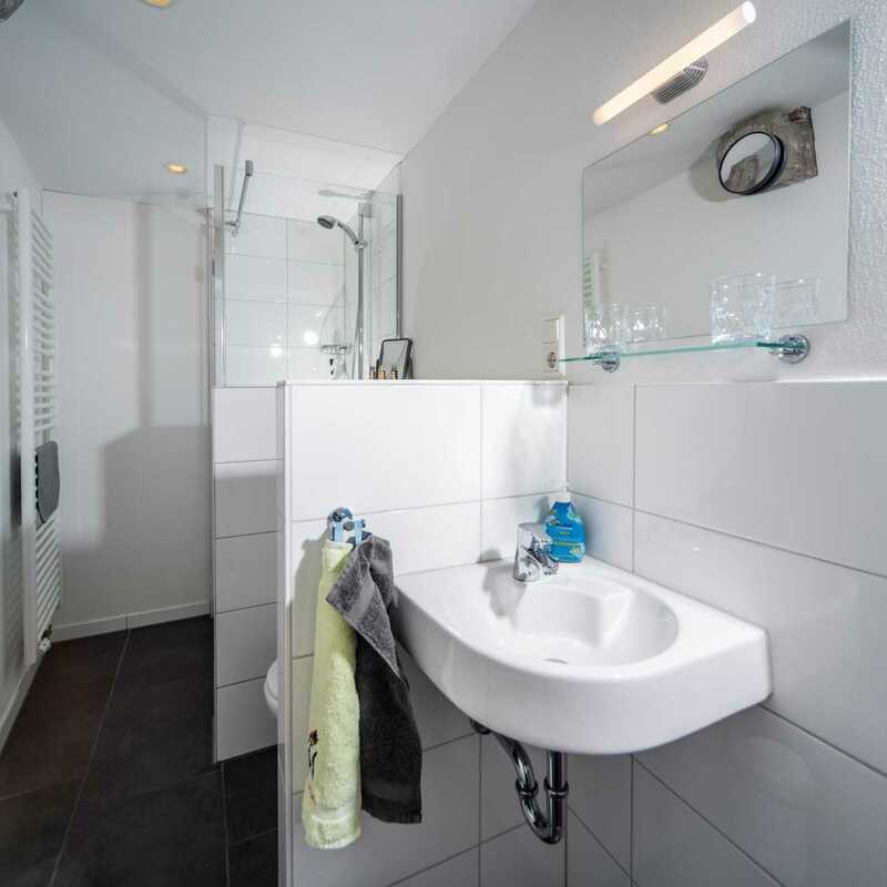 1 Schlafzimmer mit einem Boxspringbett (2 Matratzen 90/200), Kleiderschrank, Sessel, Bettwäsche, TV, 1 Wohnküche mit allem Komfort, Garderobe, 1 Bad mit Dusche, Waschbecken und Toilette. Handtücher, Föhn und Toilettenpapier werden gestellt. Deckenhöhe: 196 cm.